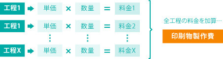 印刷物の製作費は、印刷物の製作工程ごとに、「単価×数量」で料金を算出し、その料金を全工程分だけ加算して算出する。