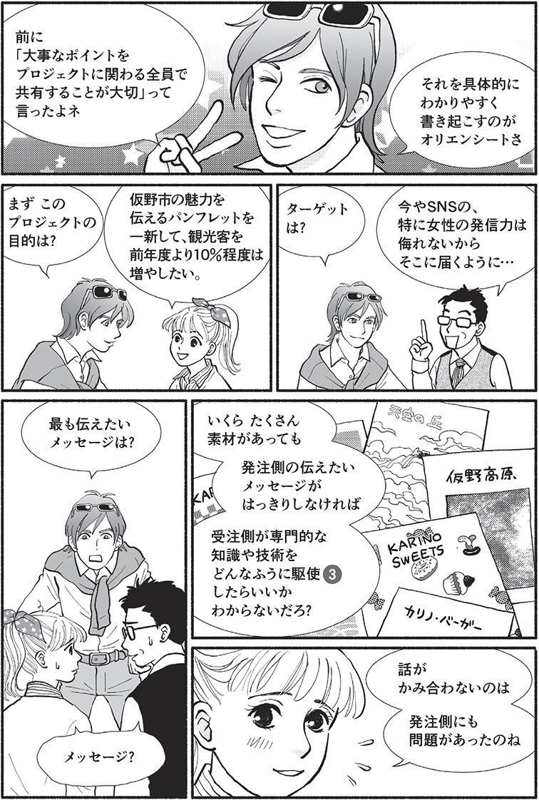 クリエイティブワークを進める上で、プロジェクトの概要を説明するためにオリエンテーション(説明会)を開催する。ここで、作成したオリエンテーションシートを配布する。オリエンテーションシートの内容については、オリエンテーションにおける質疑応答を行うことで、疑義の解決や認識のズレなどを防ぐことが可能である。