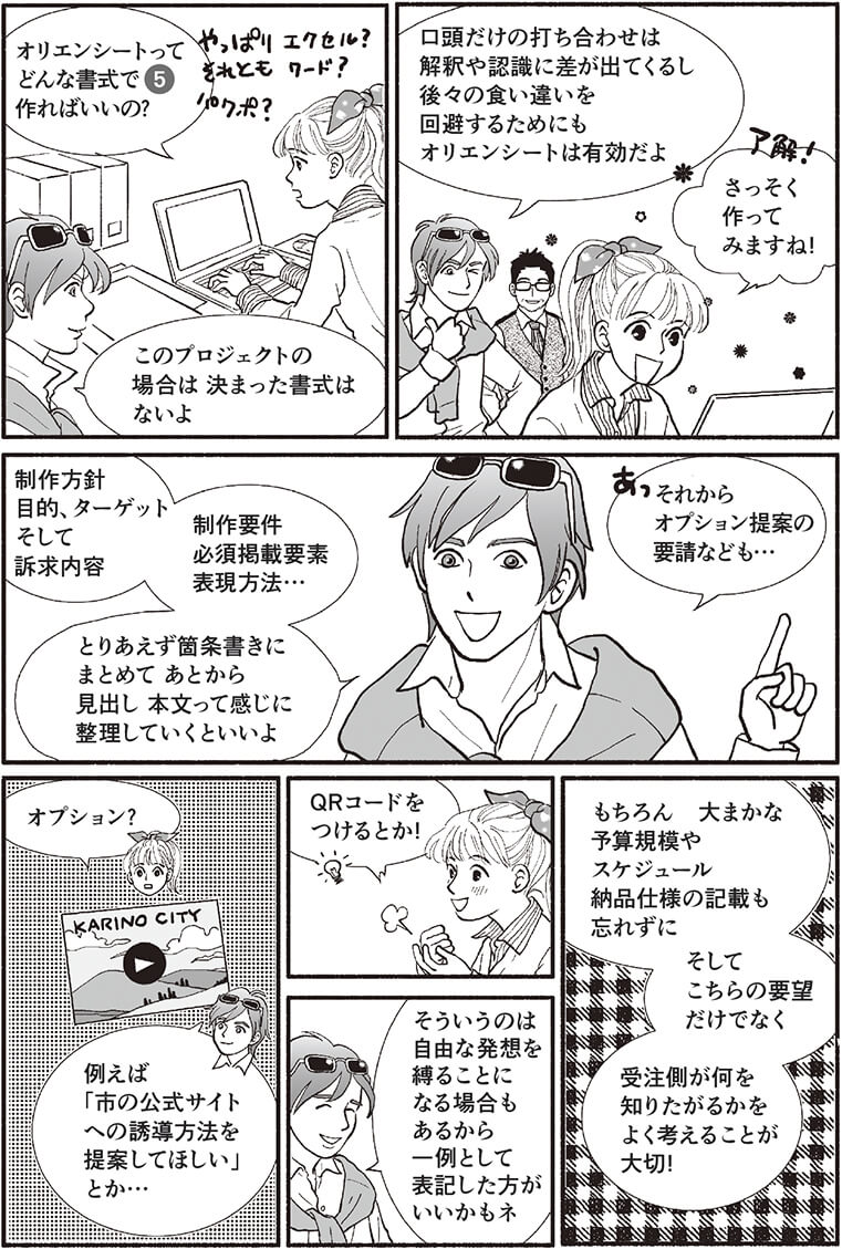 ケーススタディの第2 話では、メディア制作について、発注者が課題や各種要件を整理し、受注者に伝えるた めの「オリエンテーションシート」(略称:オリエンシート)の作成プロセスを解説する。