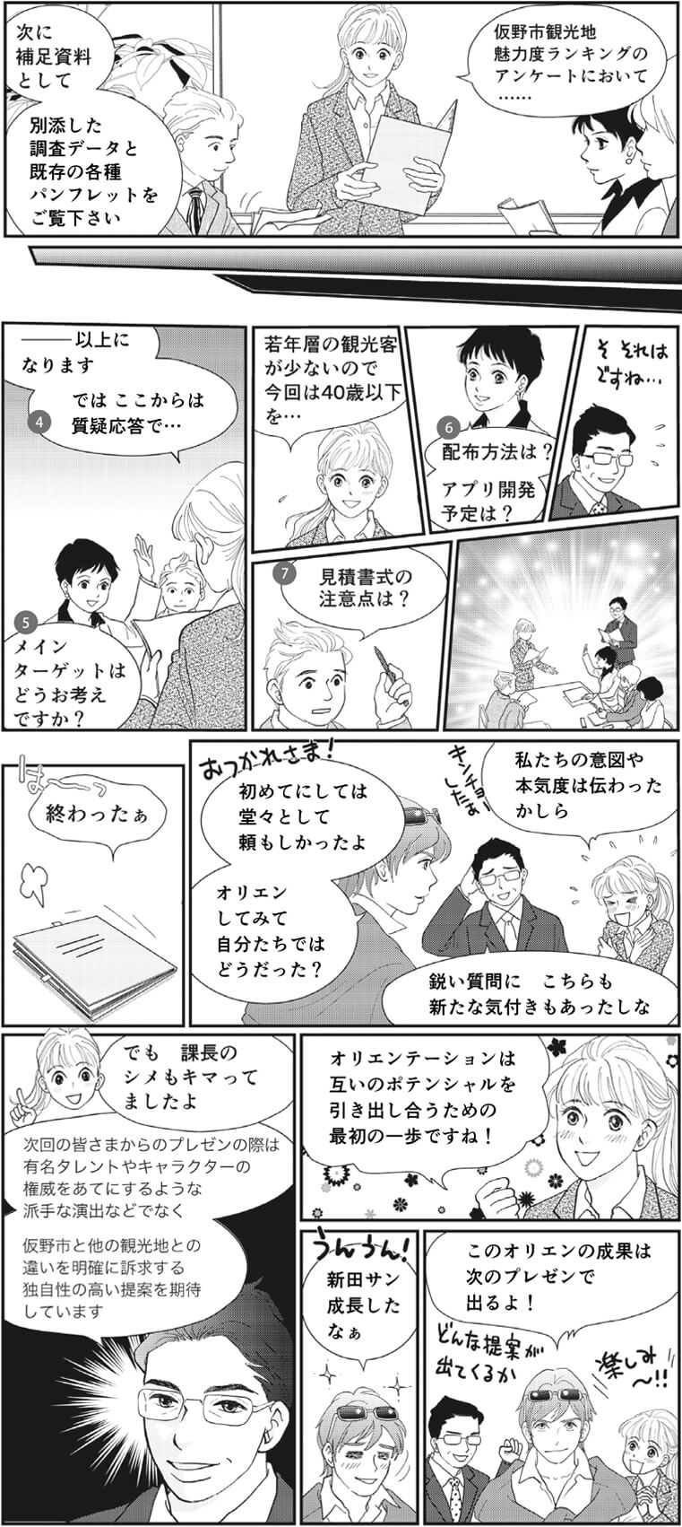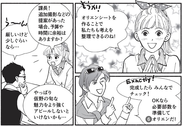 なお、オリエンテーション終了後、受注者は「与件の分析」「提案の趣旨」「進行スケジュール」などを「企画書」としてまとめ、「カンプリヘンシブ(カンプ)」と呼ばれる制作物の試作サンプルと、一連の業務に対する見積書を添付し、発注側に対してプレゼンテーション(提案)を行う。発注者は受注者のプレゼンテーションに対し、評価や採否を適正に回答する義務があり、その評価はオリエンテーションシートに沿って行