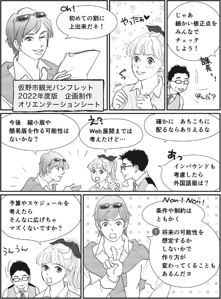 ここでは、観光パンフレット企画制作のリーダーとして、一連のプロセスを懸命に学び、実践していく。