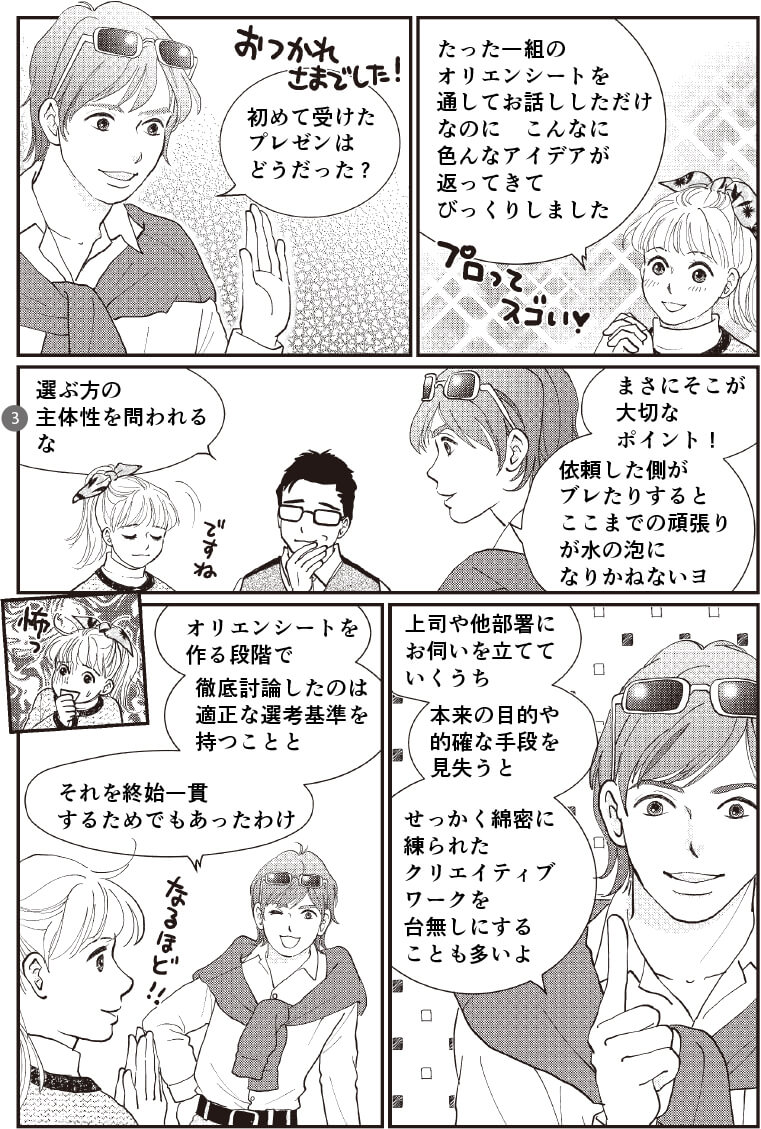 なお、オリエンテーション終了後、受注者は「与件の分析」「提案の趣旨」「進行スケジュール」などを「企画書」としてまとめ、「カンプリヘンシブ(カンプ)」と呼ばれる制作物の試作サンプルと、一連の業務に対する見積書を添付し、発注側に対してプレゼンテーション(提案)を行う。発注者は受注者のプレゼンテーションに対し、評価や採否を適正に回答する義務があり、その評価はオリエンテーションシートに沿って行う必要がある。